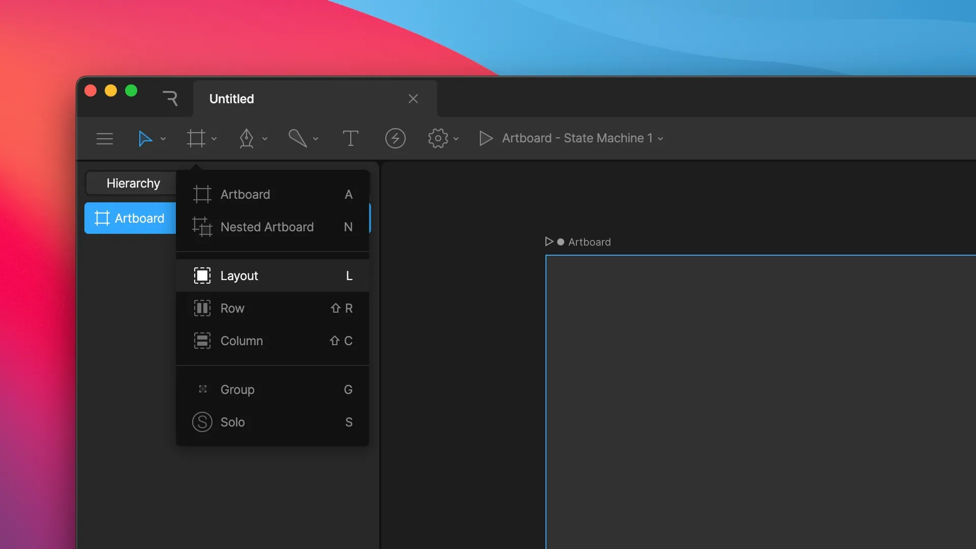 • Layout: A single Layout container. Select the tool and drag on an artboard to create the Layout. Drag directly onto the Artboard to create an Absolute Layout or on top of an existing Layout to create a Relative child. In addition, any objects positioned within the bounds of the newly created Layout will automatically themselves be wrapped in Layouts and absolutely positioned inside the new Layout.